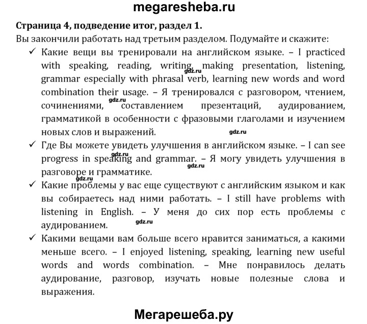 Подробный решебник (ГДЗ) по Английскому языку за 8 (восьмой) класс Student's Book - готовый ответ раздел 1 - Подведение итогов. Авторы учебника: Афанасьева, Михеева, Углубленный уровень. Издательство: Просвещение 2014.