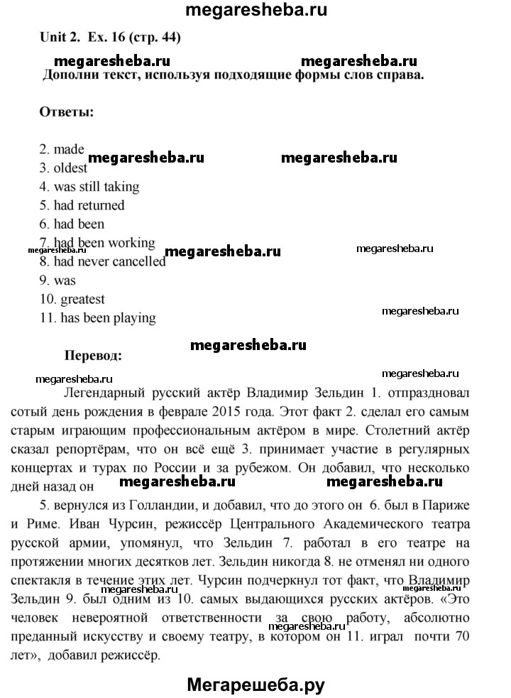 Подробный решебник (ГДЗ) по Английскому языку за 8 (восьмой) класс лексико-грамматический практикум rainbow - готовый ответ страница - 44. Авторы учебника: Афанасьева, Михеева, Баранова. Издательство: Дрофа 2016-2024.