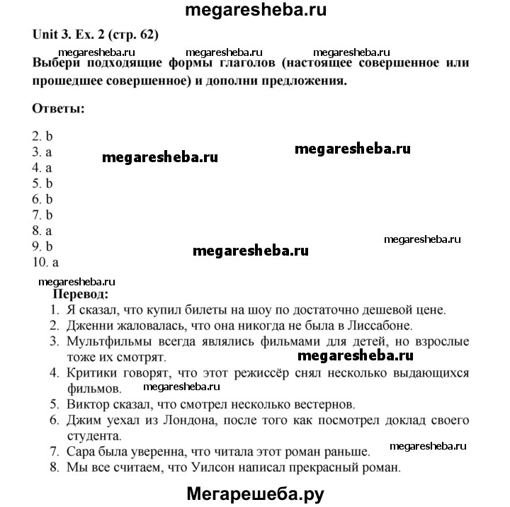 Подробный решебник (ГДЗ) по Английскому языку за 8 (восьмой) класс лексико-грамматический практикум rainbow - готовый ответ страница - 62. Авторы учебника: Афанасьева, Михеева, Баранова. Издательство: Дрофа 2016-2024.