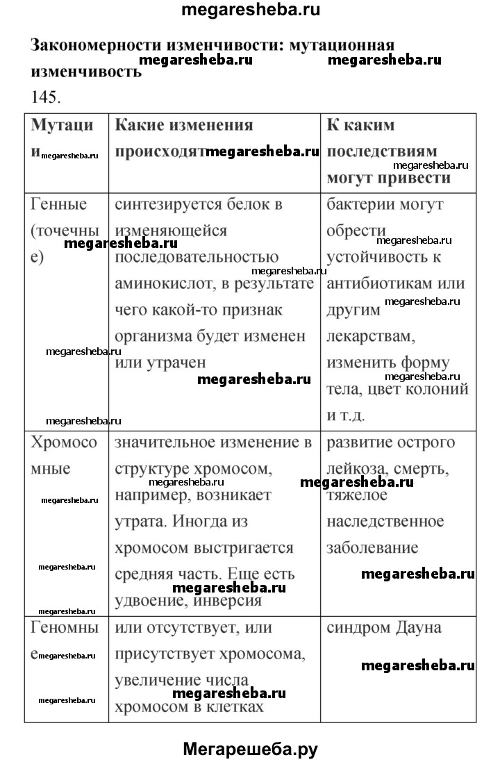 Подробный решебник (ГДЗ) по Биологии за 9 (девятый) класс рабочая тетрадь - готовый ответ номер - 145. Авторы учебника: Пасечник, Швецов. Издательство: Дрофа 2019.