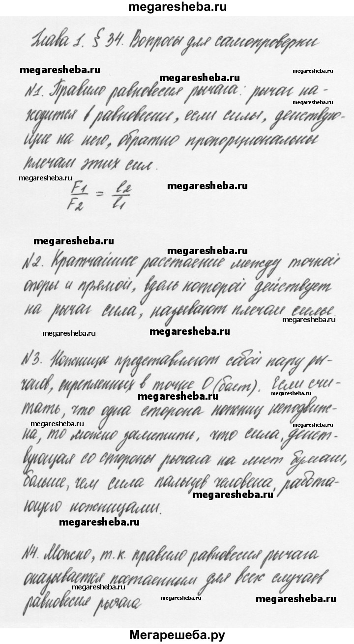 1. В чем состоит правило равновесия рычага? 2. Что называют плечом силы? 3. Объясните действие рычага на каком-либо примере. 4. Можно ли правило равновесия рычага назвать законом? Ответ обоснуйте.