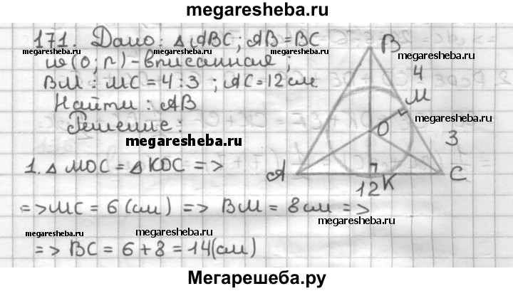 171. Боковая сторона равнобедренного треугольника делится точкой касания вписанной окружности в отношении 3 : 4, считая от вершины угла при основании треугольника. Найдите боковую сторону треугольника, если его основание равно 12 см.