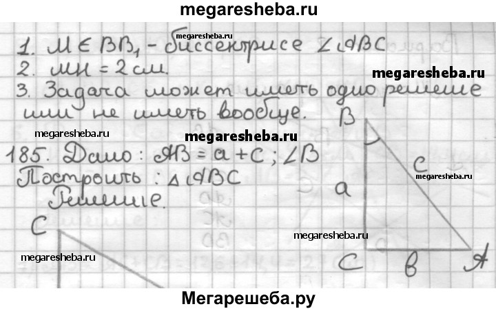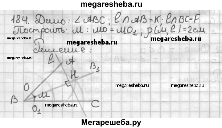 184. Прямая l пересекает стороны угла ABC. Постройте точку, принадлежащую углу, равноудалённую от его сторон и находящуюся на расстоянии 2 см от прямой l. Сколько решений может иметь задача?