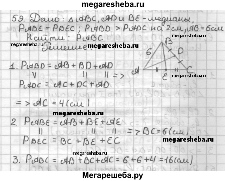 59. В треугольнике ABC проведены медианы AD и BE. Периметры треугольников ABE и ВЕС равны, а периметр треугольника ABD больше периметра треугольника ADC на 2 см. Найдите периметр треугольника ABC, если АВ = 6 см.