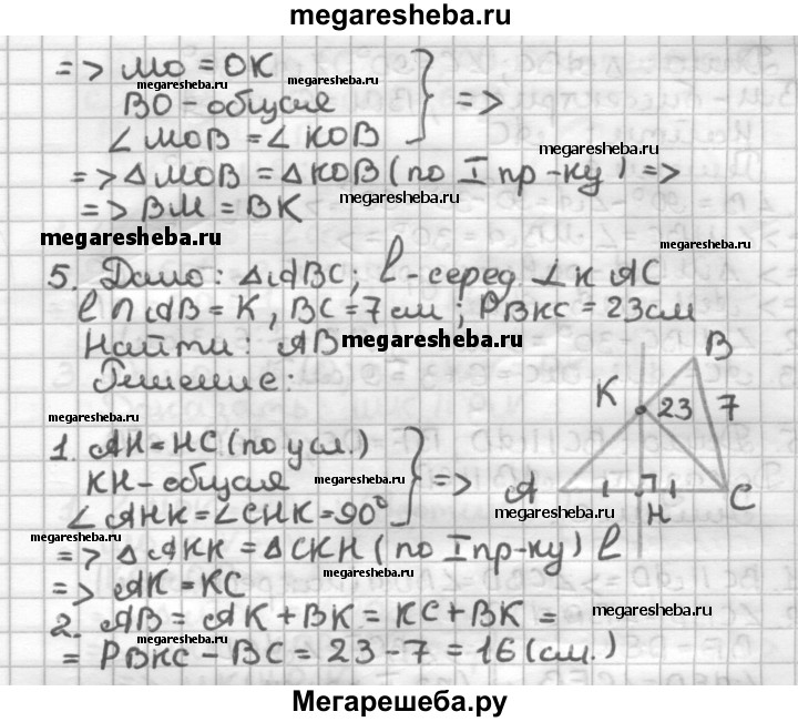Тема. Треугольники 1. Докажите равенство треугольников ABD и CDB (рис. 275), если ∠ABD = ∠CDB и АВ= CD. 2. Найдите стороны равнобедренного треугольника, если его периметр равен 76 см, а основание на 14 см меньше боковой стороны. 3. На рисунке 276 ∠ABE = ∠CBE, ∠AEB = ∠CEB. Докажите равенство отрезков AD и CD. 4. На боковых сторонах АВ и ВС равнобедренного треугольника ABC отметили соответственно точки М и К так, что ∠BAK = ∠BCM. Докажите, что ВМ -= ВК. 5. Серединный перпендикуляр стороны АС треугольника ABC пересекает его сторону АВ в точке К. Найдите сторону АВ треугольника ABC, если ВС = 7 см, а периметр треугольника ВКС равен 23 см.