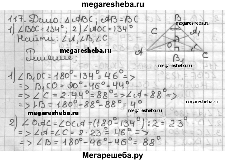 117. Один из углов, образованных при пересечении биссектрис двух углов равнобедренного треугольника, равен 134°. Найдите углы треугольника. Сколько решений имеет задача?