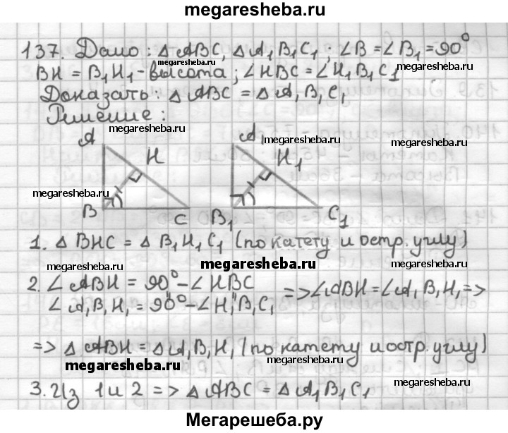 137. Докажите равенство прямоугольных треугольников по высоте, проведённой из вершины прямого угла, и углу, который она образует с одним из катетов.