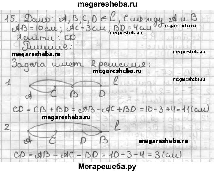 15. Точки А, В, С и D лежат на одной прямой. Точка С лежит между точками А и В. Найдите длину отрезка CD, если АВ = 10 см, АС = 3 см, BD = 4 см. Сколько решений имеет задача?
