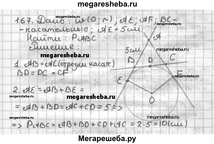 167. На рисунке 131 прямые АЕ, AF и ВС касаются окружности в точках Е, F и D соответственно. Найдите периметр треугольника ABC, если АЕ - 5 см.