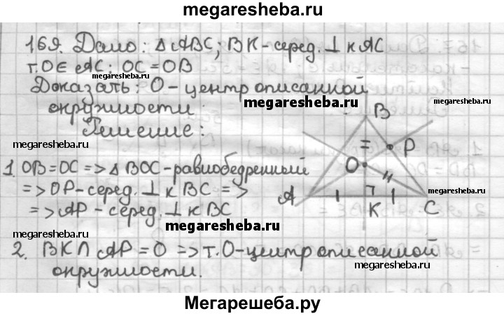 169. На серединном перпендикуляре стороны АС треугольника ЛВС отмечена такая точка О, что ОС = ОВ. Докажите, что точка О — центр окружности, описанной около треугольника ABC.