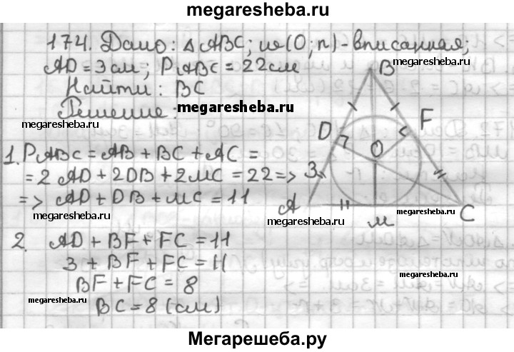 174. Окружность, вписанная в треугольник ABC, касается стороны АВ в точке D. Найдите сторону ВС, если AD = 3 см, а периметр треугольника ABC равен 22 см.