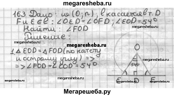 163. Прямая касается окружности с центром О в точке D. На касательной по разные стороны от точки D отметили точки Е и F такие, что ZOED - ZOFD. Найдите угол FOD, если ∠EOD = 54°.