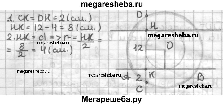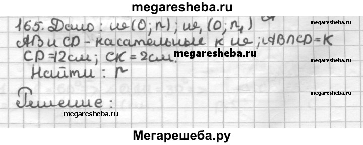 165. На рисунке 261 две окружности имеют общий центр О. К меньшей из них провели перпендикулярные касательные АВ и CD, пересекающиеся в точке К. Найдите радиус меньшей окружности, если CD = 12 см, СК = 2 см.