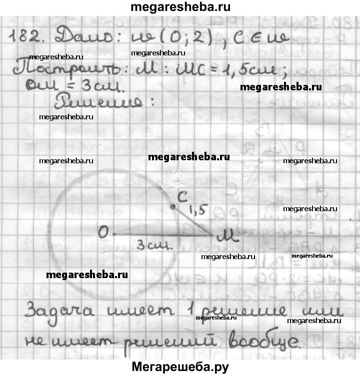 182. Даны окружность радиусом 2 см и принадлежащая ей точка С. Постройте точку, удалённую от точки С на 1,5 см и от центра окружности на 3 см. Сколько решений имеет задача?