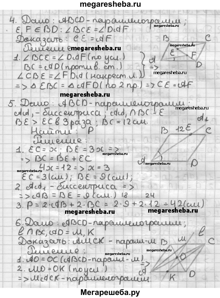 1. Одна из сторон параллелограмма на 6 см больше другой, а его периметр равен 48 см. Найдите стороны параллелограмма. 2. В прямоугольнике ABCD диагонали пересекаются в точке О, АВ - 9 см, АС - 16 см. Найдите периметр треугольника COD. 3. Один из углов ромба равен 72°. Найдите углы, которые образует сторона ромба с его диагоналями. 4. На диагонали BD параллелограмма ABCD отметили точки Е и F так, что ВСЕ = DAF (точка Е лежит между точками В и F). Докажите, что СЕ = AF. 5. В параллелограмме ABCD биссектриса угла А пересекает сторону ВС в точке Е. Отрезок BE больше отрезка ЕС в 3 раза. Найдите периметр параллелограмма, если ВС - 12 см. 6. Прямая проходит через середину диагонали АС параллелограмма ABCD и пересекает стороны ВС и AD в точках М и К соответственно. Докажите, что четырёхугольник АМСК — параллелограмм.