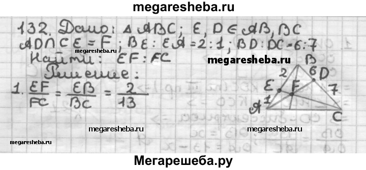 132 На сторонах АВ и ВС треугольника АВС отметили точки Е и D соответственно. Отрезки AD и СЕ пересекаются в точке F. В каком отношении точка Оделит отрезок СЕ, если BE : £4 = 2 : 1 и BD : DC =6:7?