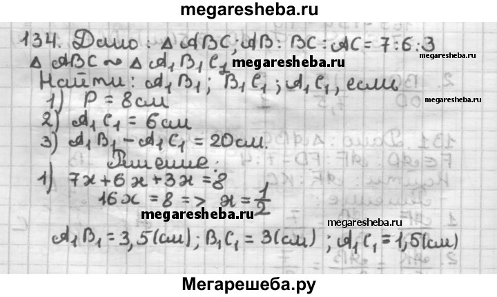 134 Стороны треугольника относятся как 7:6:3. Найдите стороны подобного ему треугольника, если: 1, его периметр равен 8 см; 2, его наименьшая сторона равна 6 см; 3, разность его наибольшей и наименьшей сторон равна 20 см.