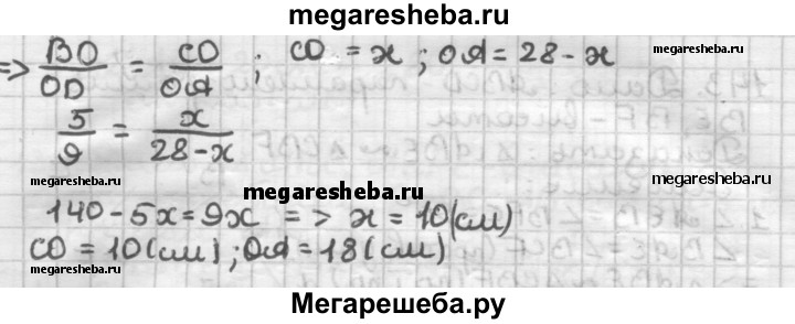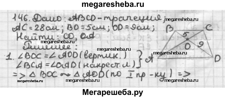 146 Одна из диагоналей трапеции равна 28 см и делит другую диагональ на отрезки длиной 5 см и 9 см. Найдите отрезки, на которые точка пересечения диагоналей делит данную диагональ.