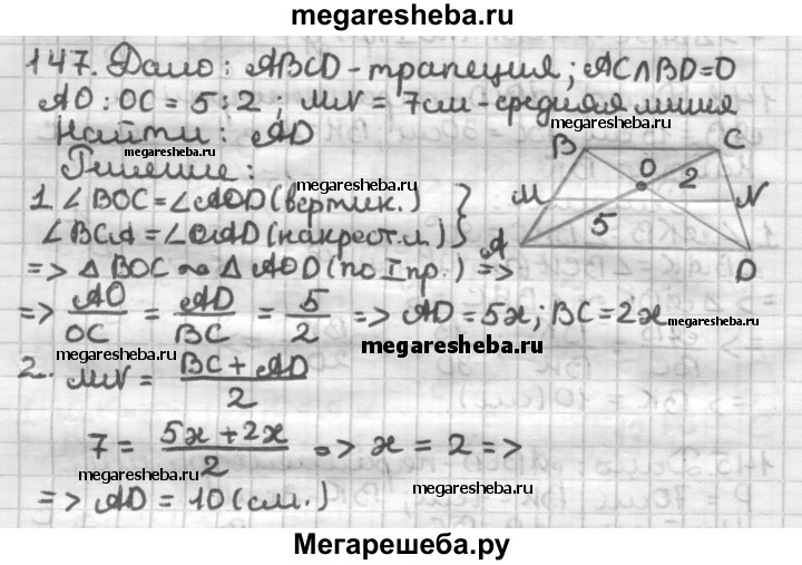 147 В трапеции ABCD (ВС || AD) О — точка пересечения диагоналей, АО : ОС = 5 : 2. Найдите большее основание трапеции, если её средняя линия равна 7 см.
