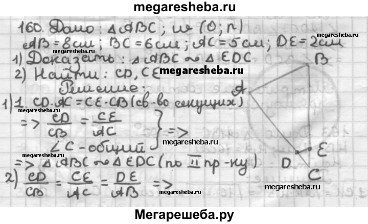 160. Через вершины А и В треугольника АВС проведена окружность, пересекающая стороны АС и ВС в точках D и Е соответственно. Докажите, что треугольники АВС и EDC подобны. Найдите отрезки CD и СЕ, если АВ = 8 см, ВС = 6 см, АС = 5 см, DE = 2 см.