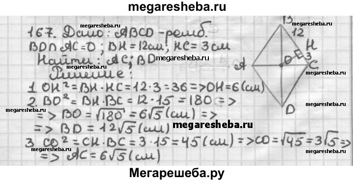 167 Перпендикуляр, проведённый из точки пересечения диагоналей ромба к стороне, делит её на отрезки длиной 3 см и 12 см. Найдите диагонали ромба.