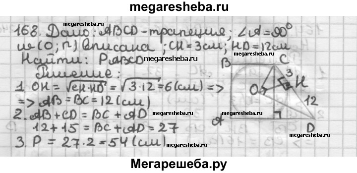 168 Точка касания окружности, вписанной в прямоугольную трапецию, делит большую боковую сторону на отрезки длиной 3 см и 12 см. Найдите периметр трапеции.