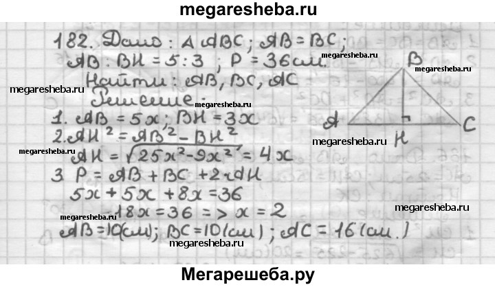 182 Боковая сторона равнобедренного треугольника относится к высоте, проведённой к основанию, как 5 : 3. Найдите стороны треугольника, если его периметр равен 36 см.
