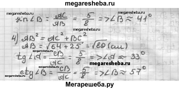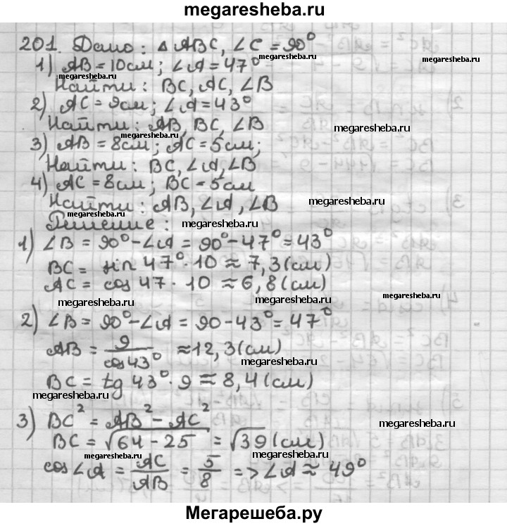 201 Решите прямоугольный треугольник ABC (∠C = 90°) no известным элементам: 1) АВ = 10 см,∠14 = 47°; 3) АВ = 8 см, АС =5 см; 2) AС = 9 см, ∠A = 43°; 4) АС = 8 см, ВС =5 см.