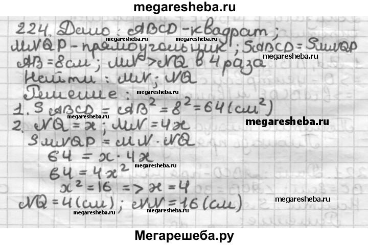 224 Квадрат и прямоугольник равновелики. Сторона квадрата равна 8 см, а одна из сторон прямоугольника в 4 раза больше другой. Найдите стороны прямоугольника.