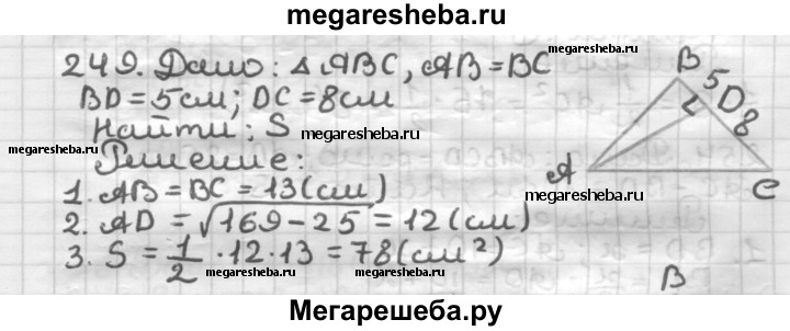 249 Высота AD равнобедренного треугольника АВС (АВ = = ВС) делит сторону ВС на отрезки BD = 5 см и DC = = 8 см. Найдите площадь треугольника АВС.
