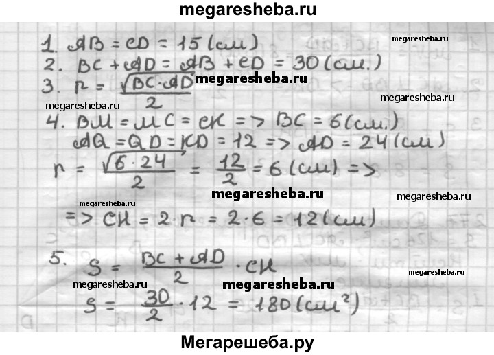 274 Точка касания окружности, вписанной в равнобокую трапецию, делит её боковую сторону на отрезки длиной 3 см и 12 см. Найдите площадь трапеции.