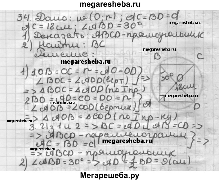 34 В окружности с центром О проведены диаметры АС и BD (рис. 8). Докажите, что четырёхугольник ABCD является прямоугольником. Найдите отрезок ВС, если АС= 18 см, ∠ABD = 30°.