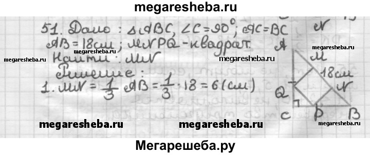 51 Гипотенуза равнобедренного прямоугольного треугольника равна 18 см. Квадрат построен так, что две его вершины лежат на гипотенузе, а две другие — на катетах данного треугольника. Найдите сторону квадрата.