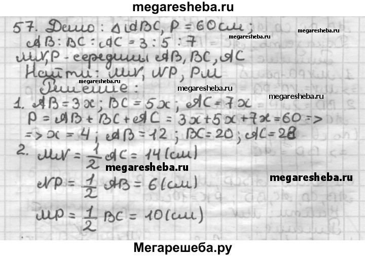 57 Периметр треугольника равен 60 см, а его стороны относятся как 3:5:7. Найдите стороны треугольника, вершины которого — середины сторон данного треугольника.