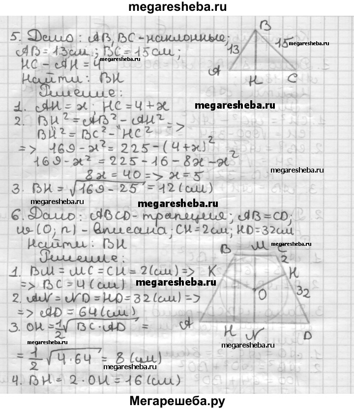 1. Катет прямоугольного треугольника равен 30 см, а его проекция на гипотенузу — 18 см. Найдите гипотенузу треугольника. 2. В прямоугольном треугольнике катеты равны 8 см и 15 см. Найдите периметр треугольника. 3. Сторона ромба равна 10 см, а одна из диагоналей — 16 см. Найдите вторую диагональ ромба. 4. Высота АК остроугольного равнобедренного треугольника АВС (АВ = ВС) равна 12 см, a KB = 9 см. Найдите основание треугольника АВС. 5. Из точки к прямой проведены две наклонные, длины которых равны 13 см и 15 см. Найдите расстояние от точки до прямой, если разность проекций наклонных на эту прямую равна 4 см 6. Окружность, вписанная в равнобокую трапецию, делит точкой касания боковую сторону на отрезки длиной 2 см и 32 см. Найдите высоту трапеции.
