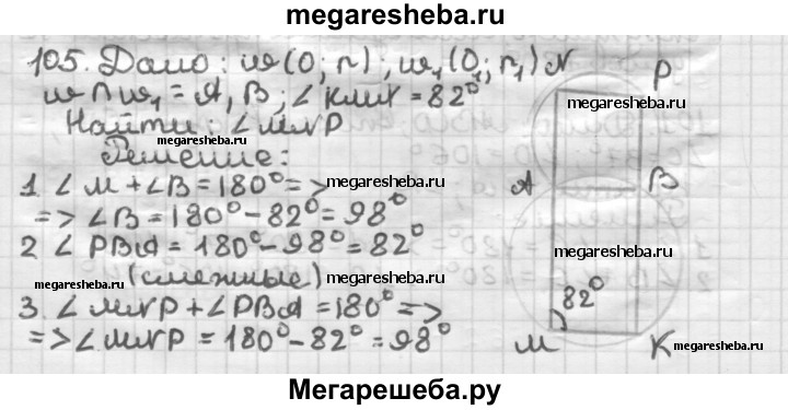 105. Две окружности пересекаются в точках А и В. Прямая, проходящая через точку А, пересекает окружности в точках М и N, а прямая, проходящая через точку В, — в точках К и Р (рис. 58). Найдите угол MNP, если ∠KMN - 82°.
