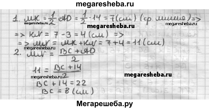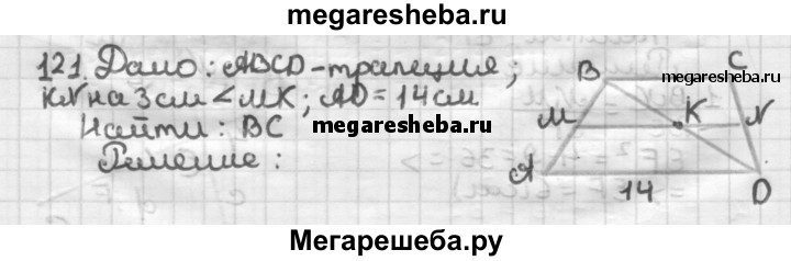 121. Диагональ трапеции делит её среднюю линию на отрезки, один из которых на 3 см меньше другого. Найдите меньшее основание трапеции, если её большее основание равно 14 см.