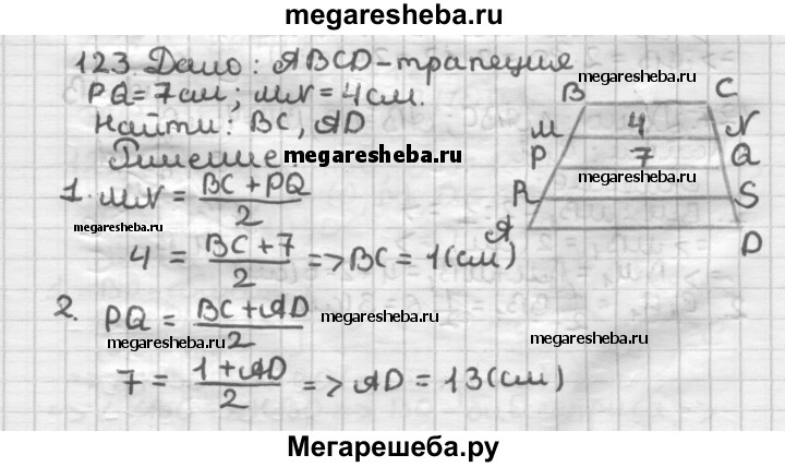123. Боковую сторону трапеции разделили на 4 равных отрезка и через точки деления провели прямые, параллельные основаниям. Два меньших отрезка этих прямых, принадлежащие трапеции, равны 4 см и 7 см. Найдите основания трапеции.