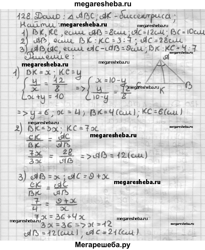 128. Отрезок АК — биссектриса треугольника АВС. Найдите: 1) отрезки ВК и КС, если АВ = 8 см, АС = 12 см, ВС - = 10 см; 2) сторону АВ, если ВК : КС = 3 : 7, АС = 28 см; 3) стороны АВ и АС, если АС - АВ - 9 см, ВК : КС = = 4:7.