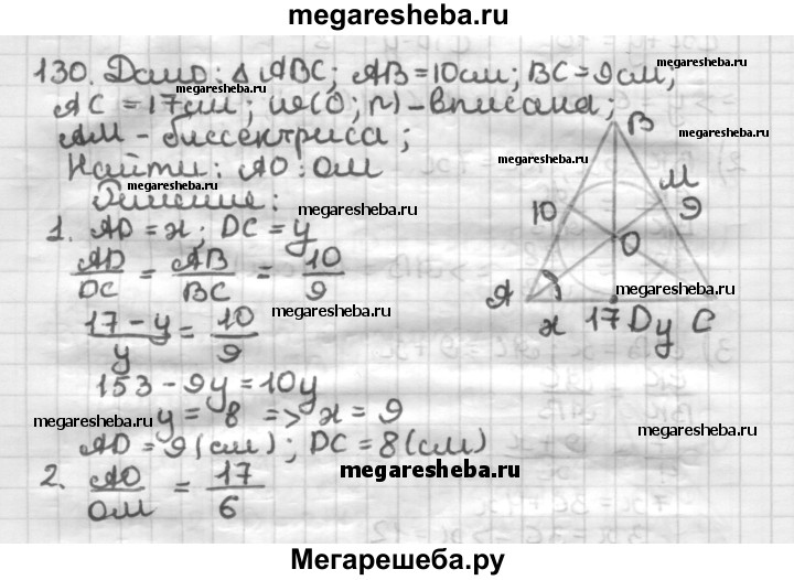 130. В треугольнике АВ С АВ = 10 см, ВС = 9 см, АС = 17 см. В каком отношении центр окружности, вписанной в треугольник, делит его биссектрису AM?