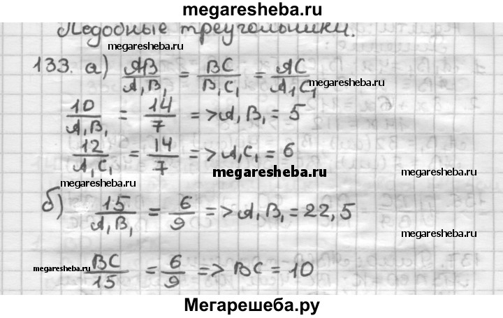 133. Известно, что AABC А1В1С1, причём стороне АВ соответствует сторона А1В1, а стороне ВС — сторона В1С1(рис. 62). Найдите неизвестные стороны этих треугольников (размеры сторон даны в сантиметрах).