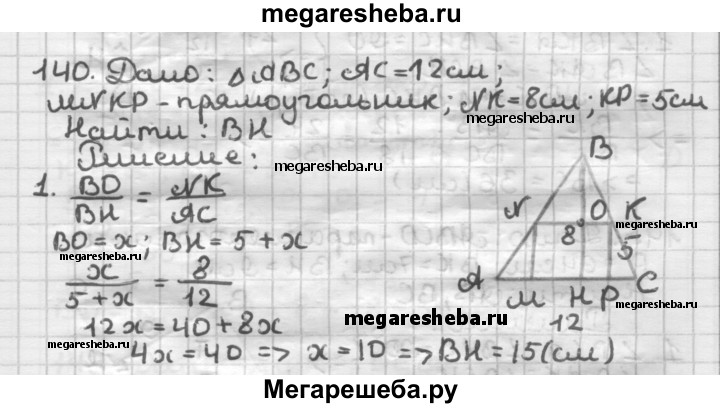 140. В треугольник со стороной 12 см вписан прямоугольник, стороны которого равны 8 см и 5 см. Большая сторона прямоугольника принадлежит данной стороне треугольника. Найдите высоту треугольника, проведённую к данной стороне.