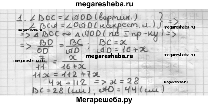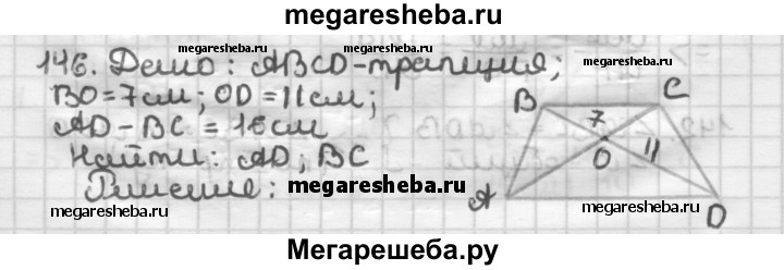 146. Точка пересечения диагоналей трапеции делит одну из диагоналей на отрезки длиной 7 см и 11 см. Найдите основания трапеции, если их разность равна 16 см.