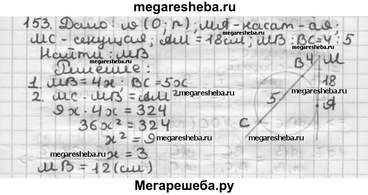 153. Через точку M проведены к окружности касательная МА (А — точка касания) и секущая, пересекающая окружность в точках В и С (точка В лежит между точками М и С). Найдите отрезок MB, если AM = 18 см и MB : ВС = 4 : 5.