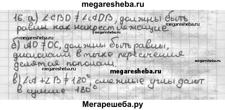 16. На рисунке 43 изображены параллелограммы. Определите, не выполняя измерений, на каких рисунках величины углов или длины отрезков обозначены неверно (длины отрезков даны в сантиметрах).