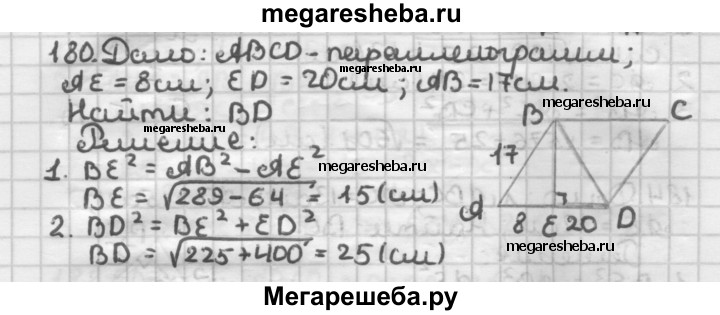 180. В параллелограмме ABCD высота BE делит сторону AD на отрезки АЕ = 8 см и ED = 20 см. Найдите диагональ BD параллелограмма, если его сторона АВ равна 17 см.
