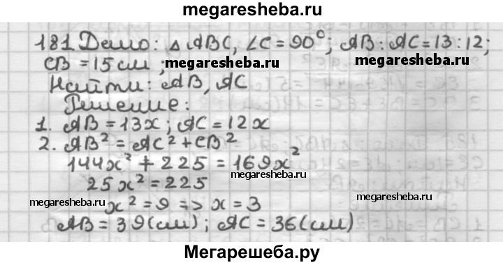 181. Гипотенуза и один из катетов прямоугольного треугольника относятся как 13 : 12, а второй катет равен 15 см. Найдите неизвестные стороны треугольника.