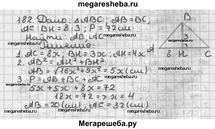 182. Основание равнобедренного треугольника относится к проведённой к нему высоте как 8:3. Найдите стороны треугольника, если его периметр равен 72 см.