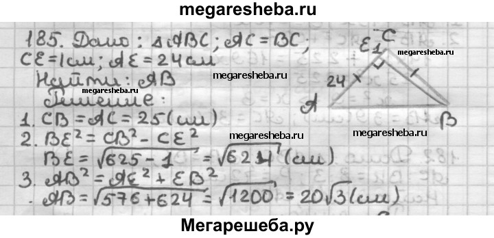 185. В равнобедренном треугольнике А В С (АС = ВС) проведена высота BE. Известно, что СЕ = 1 см, АЕ = 24 см. Найдите основание АВ треугольника. Сколько решений имеет задача?