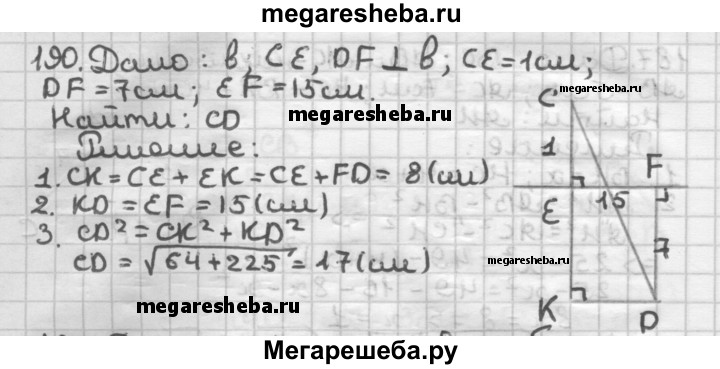 190. Точки С и D лежат в разных полуплоскостях относительно прямой Ъ. Из этих точек к прямой b проведены перпендикуляры СЕ и DF. Найдите отрезок CD, если СЕ = 1 см, DF= 7 см, EF - 15 см.